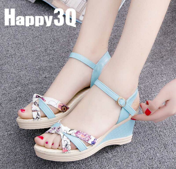 氣質優雅甜美印花羅馬鏤空搭扣防水台坡跟涼鞋-白/粉/藍35-41【AAA0212】
